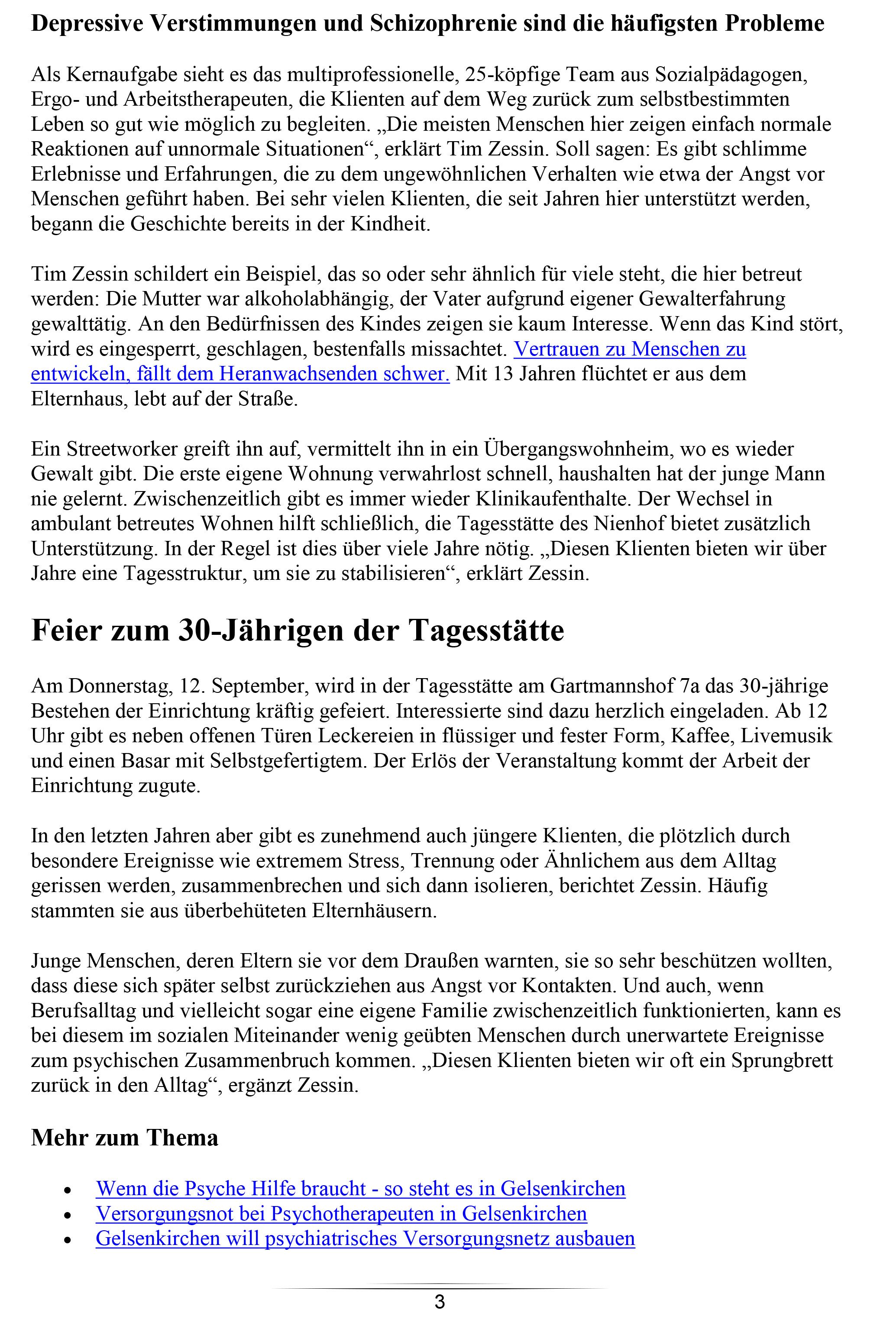 Am Donnerstag, 12. September, wird in der Tagesstätte am Gartmannshof 7a das 30-jährige Bestehen der Einrichtung kräftig gefeiert. Interessierte sind dazu herzlich eingeladen. Ab 12